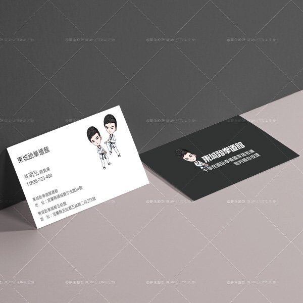 白底黑字的搭配突出品牌的專業性與信任感。卡通形象的使用增添了一份親和力,讓人感到溫暖與友善。名片背面的跆拳道人物圖示展現了品牌的核心價值與專業技能,象徵著跆拳道的力量與尊重。這樣的設計既能有效傳達出道館的專業性,又能吸引學生和家長的注意力,成為品牌推廣的重要工具。