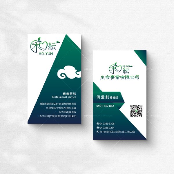 這張名片採用了綠白相間的配色,象徵著生命與和平。和紜生命事業有限公司的Logo簡約而充滿生命力,融入了自然元素,傳遞出品牌在生命服務領域的專業與溫暖。名片左側的白雲圖案,象徵著靜謐與安寧,與公司的服務性質相契合。整體設計簡潔明瞭,強調了公司在生命禮儀服務中的專業形象,讓人感受到信任與安心。