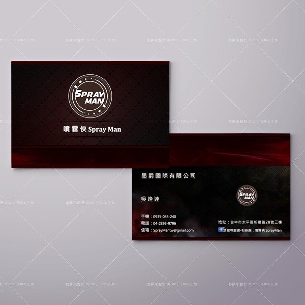 這張名片以深色為主調,搭配醒目的Logo,展現出噴霧俠 SprayMan 品牌的專業與現代感。名片的設計強調了品牌的科技感和力量,讓人一目了然地感受到品牌的專業性。Logo中央的圓形設計增添了穩定感,而星星的點綴則賦予了整體設計一些活力和動感。這張名片傳遞出品牌在噴霧技術領域中的領先地位,並強調其專業、可靠的形象。