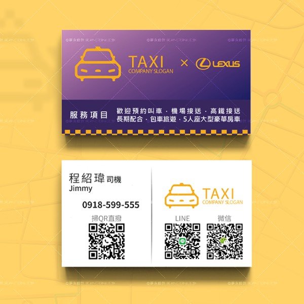 這張名片設計簡約,使用明亮的黃紫配色突出重點,展現出計程車司機的專業形象。名片上的服務項目和聯繫方式清晰明了,方便乘客快速取得聯繫並預約服務。搭配QR碼,讓乘客可以方便地掃碼進行線上聯繫,增強了服務的便利性。