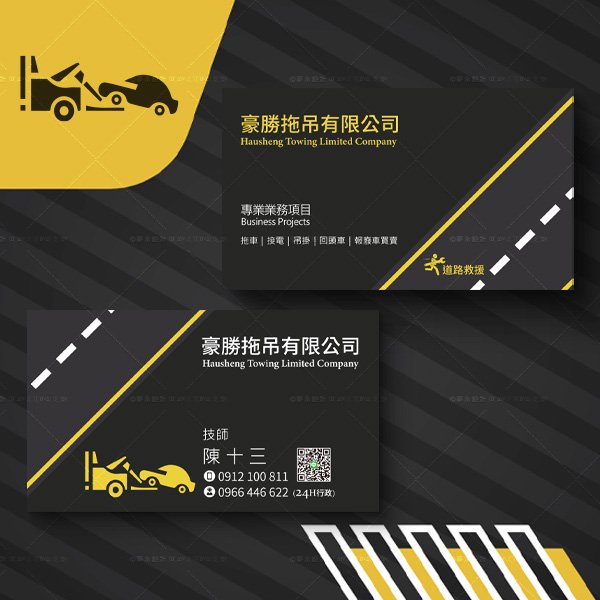 這張名片設計採用了鮮明的黑黃配色,突顯了拖吊服務的專業性與緊急性。名片左側的拖吊車圖案直接傳達了公司業務範圍,而右側的斜線設計則象徵了道路和行車安全。聯繫方式和服務項目排版整齊,方便客戶迅速取得所需資訊,展現了豪勝拖吊有限公司的專業形象和高效服務。