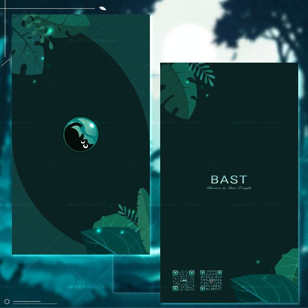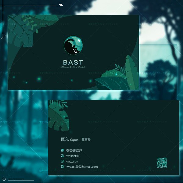 這張名片設計整體風格延續了產品的自然與健康主題。背景運用了深色調搭配森林綠的元素,營造出清新且高端的氛圍,呼應品牌天然成分的理念。同時,植物插圖巧妙地與名片排版結合增添了層次感,名片看起來簡潔又具有視覺吸引力。